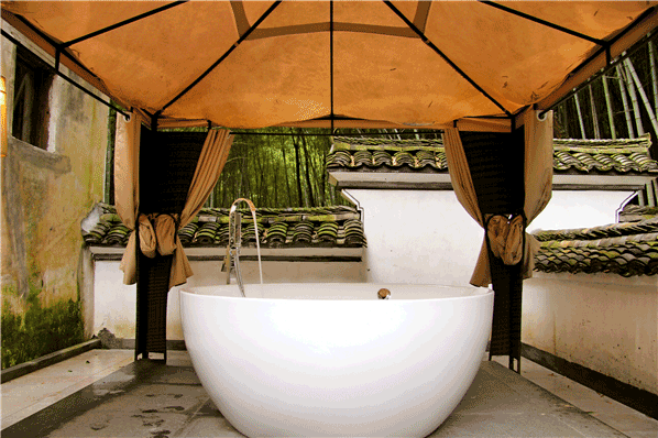 最值得一提的是套房的露天浴室。这间房不仅设了室内浴室,还特意在二楼的小院里设计了一个露天浴室。躺在露天的浴缸里,驱散一天的疲惫,恍惚间仿佛回到了远古时代,星空为被,大地为床。